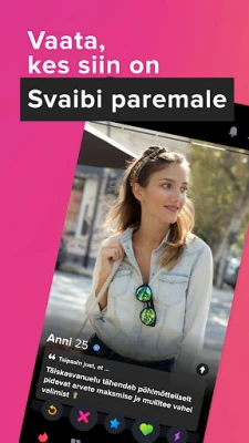 Paljud peavad Tinderit üheks populaarsemaks ja usaldusväärseimaks platvormiks uute tutvuste loomisel, kuid meie jaoks on peamine see, et leiaksid hõlpsalt ja lõbusalt üles need, kes sind ümbritsevad. Uute sidemete loomine on siin intuitiivne ja meelelahutuslik. Selleks, et köita teiste tähelepanu, vali parimad fotod ja kirjuta oma profiilile midagi, mis räägib sinust ja aitab leida ühiseid huvisid. Kedagi meeldimise märgiks saadad paremale pühkides, samas kui vasakule pühkimine jätab profiili vahele. Klapp tekib vaid siis, kui huvi on vastastikune – see on põhimõte, mis tagab ehtsad ühendused ja väldib soovimatuid üllatusi.